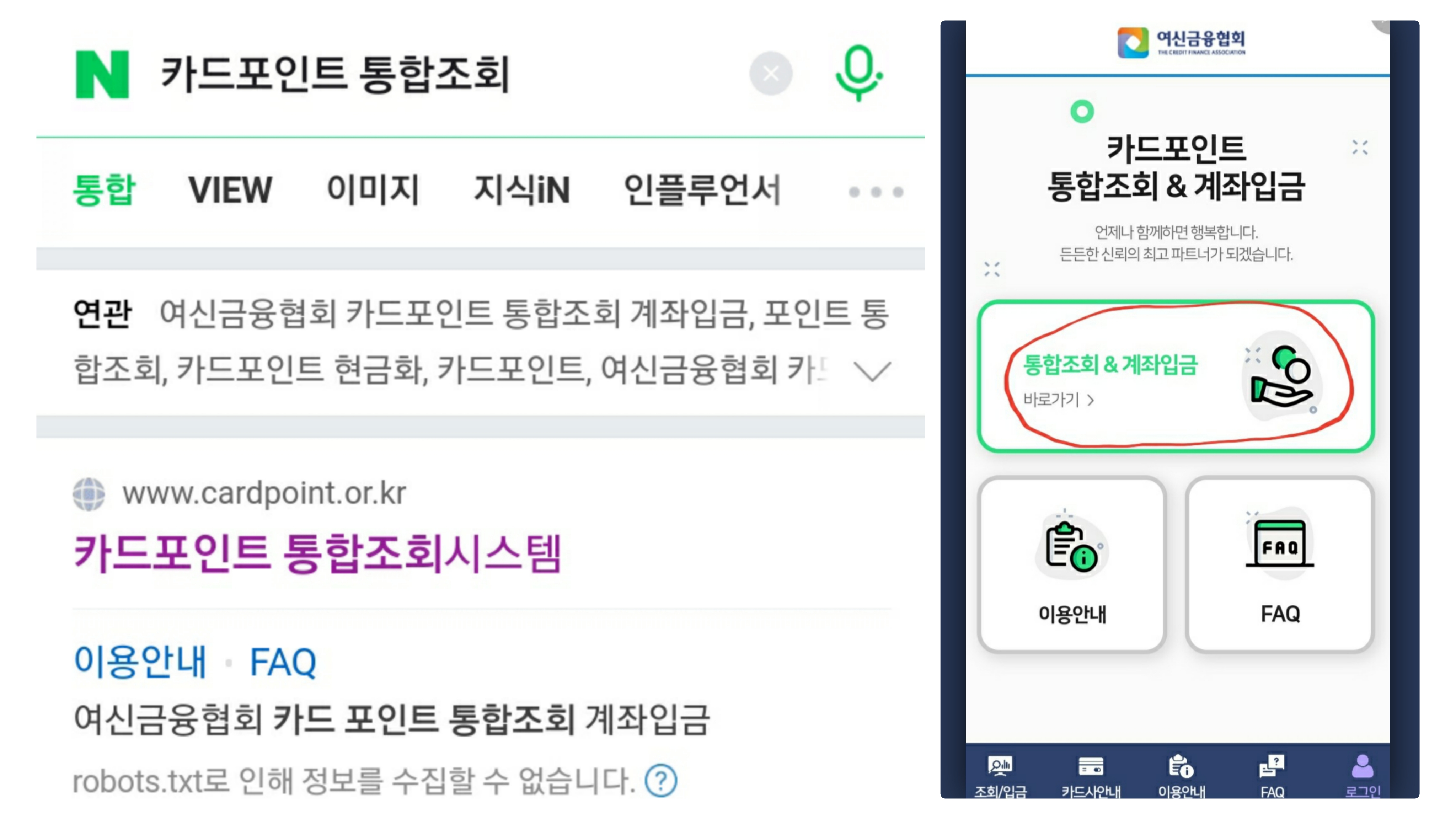 1. 검색창에 검색창에 카드 포인트 통합 조회를 검색한 뒤 클릭 합니다