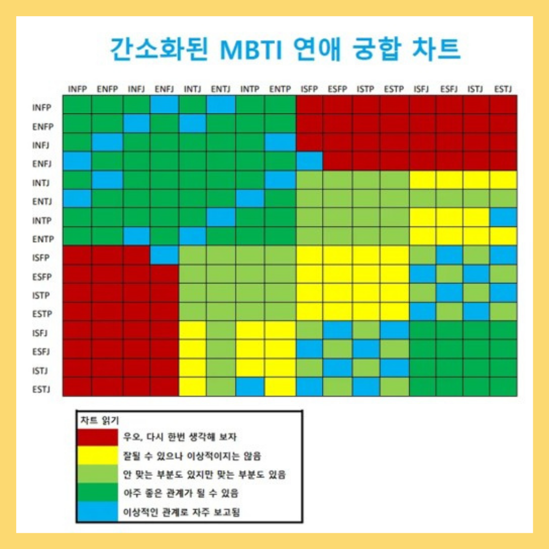 뿐만아니라 예전에는 생년월일로 보던 궁합을 심심풀이긴 하지만 MBTI검사로 궁합을 보기도 합니다. 꼭 남녀관계뿐 아니라 친구와의 관계도 궁합을 볼 수 있습니다.